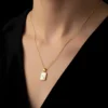 This refined and personal necklace features a delicate gold cable chain that leads gracefully down to a small rectangular pendant with softly rounded corners. The pendant is beautifully crafted with a polished gold border encasing a smooth white mother of pearl background, whose soft natural iridescence adds a genuinely luxurious and high-quality finish to the piece.