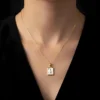 This graceful and personalized necklace features a fine gold cable chain that flows elegantly down to a small rectangular pendant with gently rounded corners. The pendant is crafted with a clean polished gold border surrounding a soft white mother of pearl background, whose delicate natural iridescence adds a quietly luxurious and high-quality quality to the overall piece.