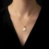 This charming and personalized necklace features a fine gold cable chain that drapes gracefully down to a small rectangular pendant with softly rounded corners. The pendant showcases a polished gold border surrounding a smooth white mother of pearl background, whose soft natural shimmer gives the piece a delicate, premium quality that looks beautiful in any light.