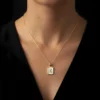 This elegant and personalized necklace features a fine gold cable chain that flows gracefully down to a small rectangular pendant with softly rounded corners. The pendant is beautifully finished with a polished gold border encasing a smooth white mother of pearl background, whose soft natural iridescence gives the piece a genuinely luxurious and high-quality appearance that stands out from ordinary initial necklaces.