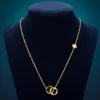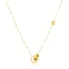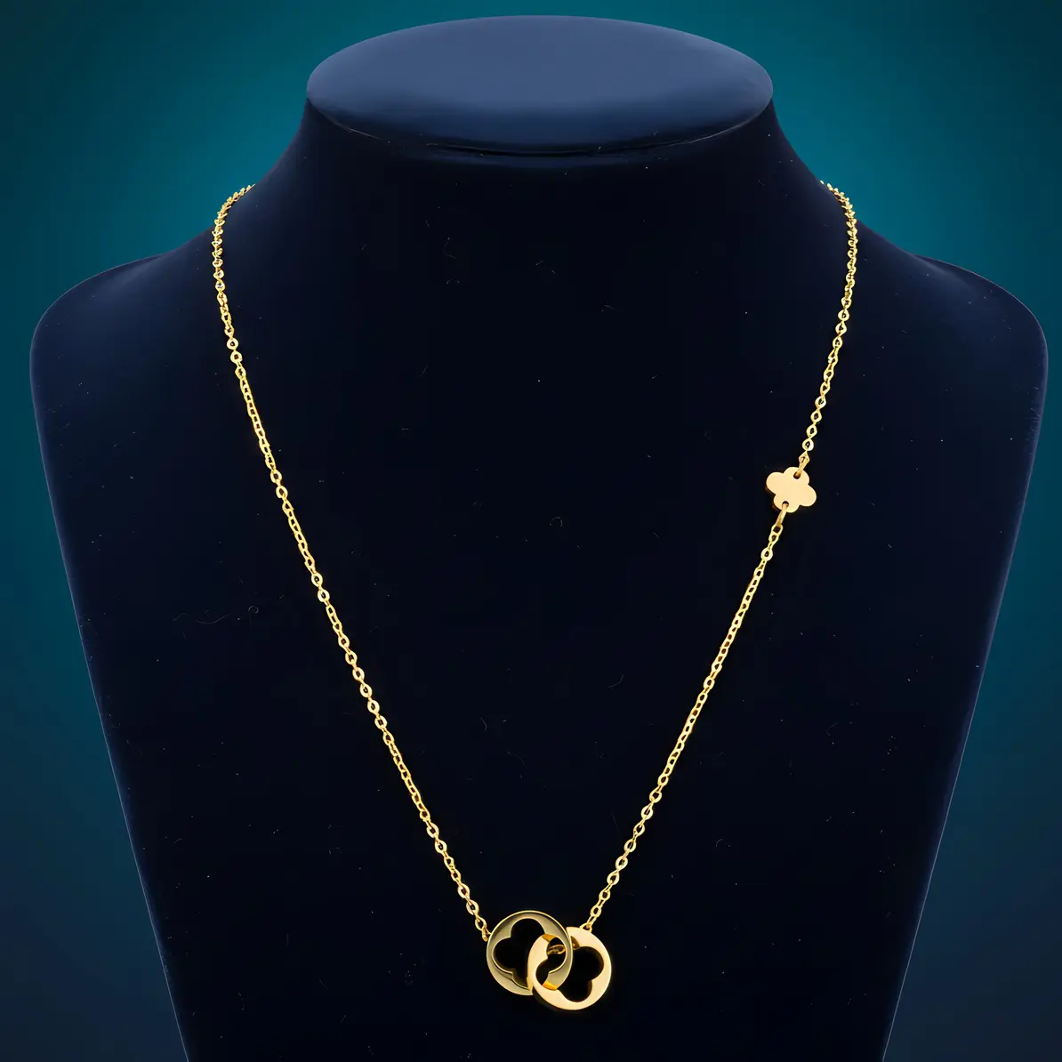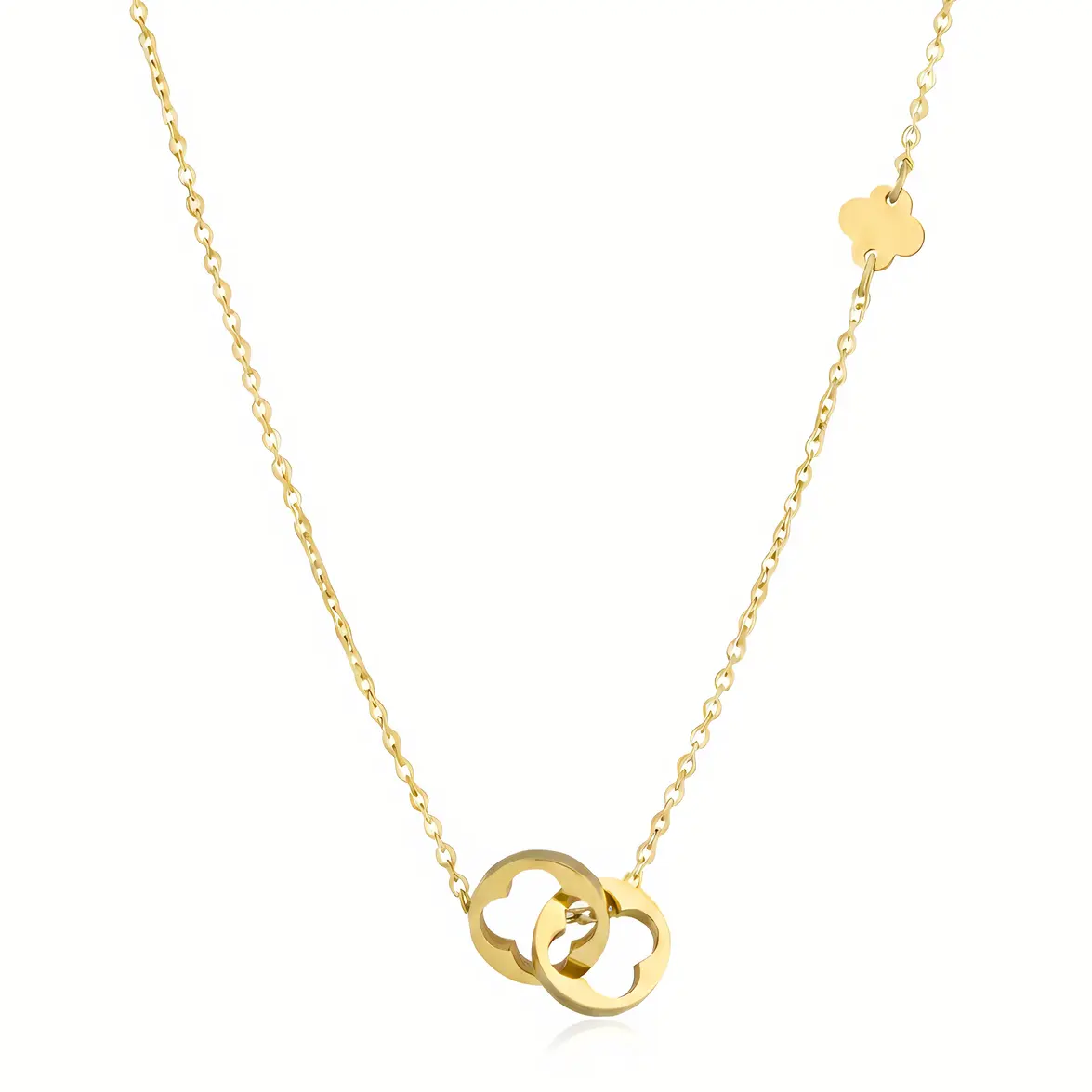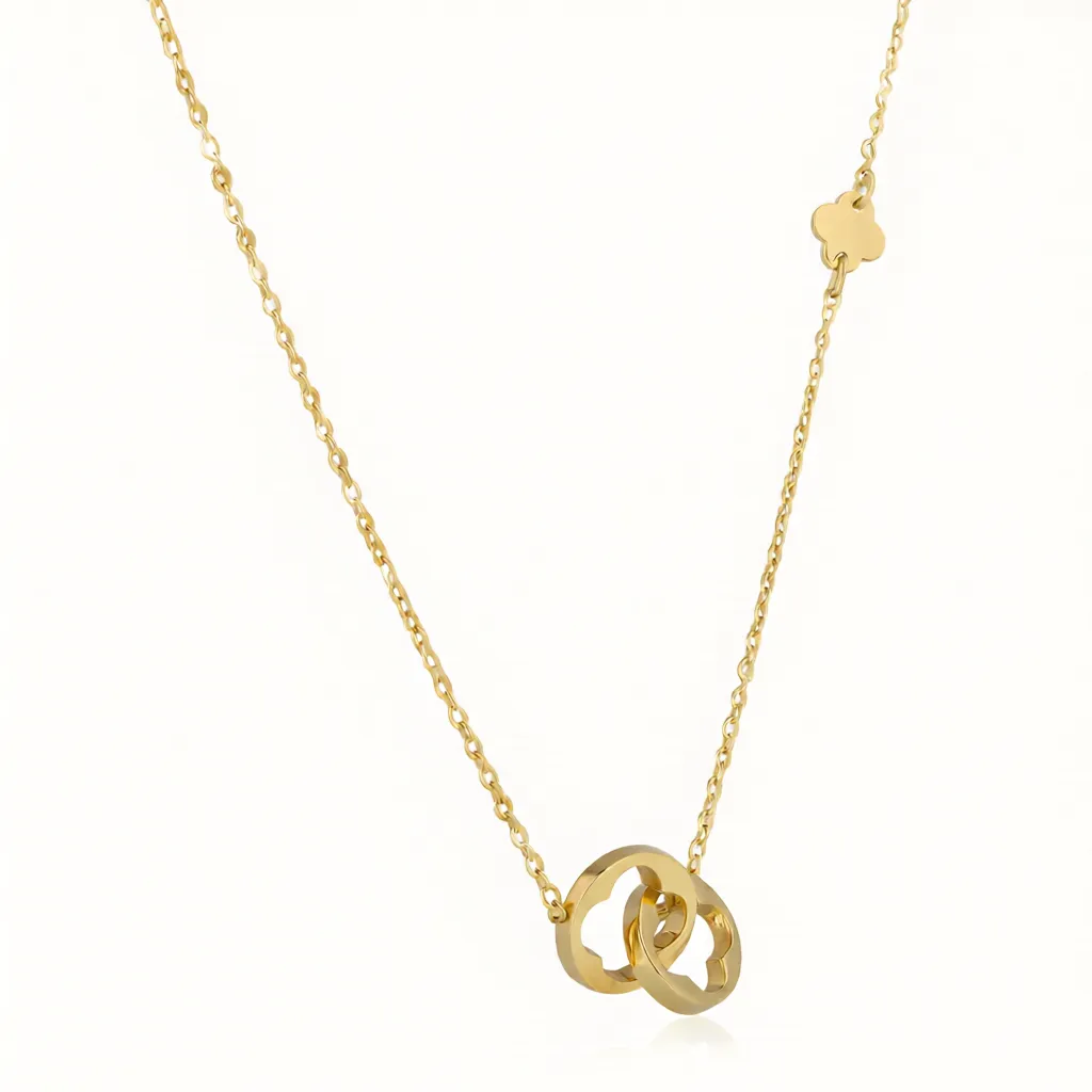The standout piece is the interlocking pendant that hangs at the center, featuring an open clover silhouette intertwined with a polished gold ring. The two shapes loop together in a modern, sculptural design that symbolizes connection and unity. The high-polished finish catches the light beautifully, creating subtle dimension and movement. This chic necklace combines a lucky clover motif with contemporary geometric styling â making it a versatile everyday piece that adds understated elegance to any look.