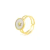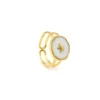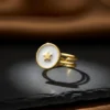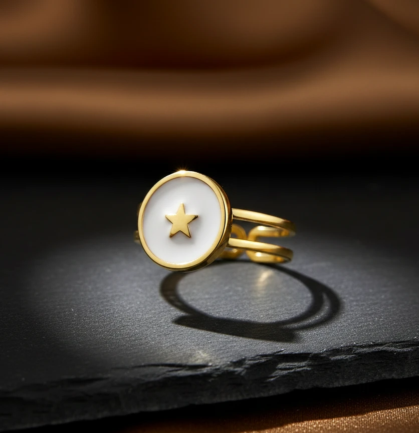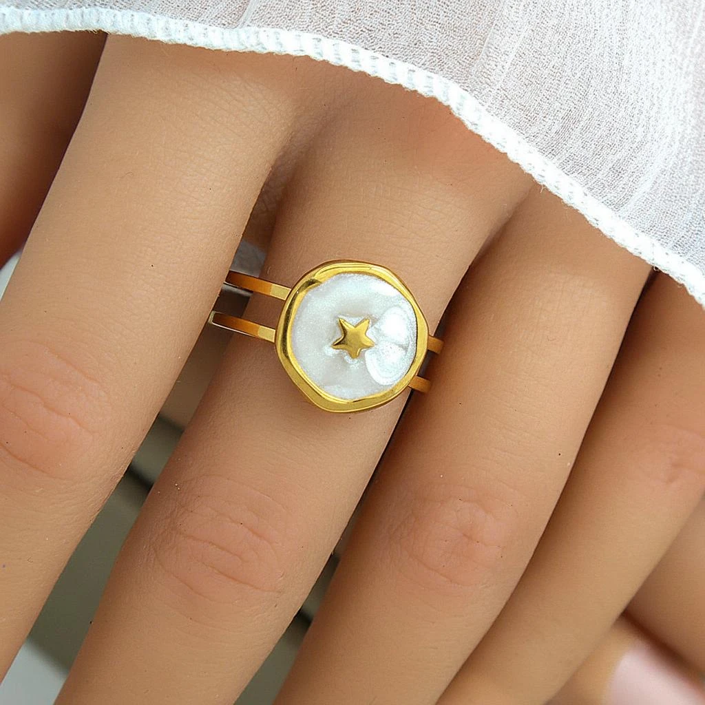 This elegant ring showcases a charming celestial-inspired design, highlighted by a delicate star set within a smooth ivory disc. The soft neutral surface contrasts beautifully with the radiant gold frame, creating a balanced and sophisticated look. The small star detail at the center adds a playful yet meaningful element, symbolizing brightness and inspiration.